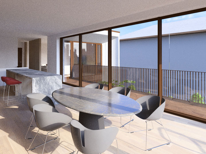 Šis namas projektuojamas nepalankiame sodo sklype Pilaitėje. Iš abiejų siauro sklypo pusių - dviaukščiai kaimynai. Šiaurinėje pusėje - intensyvaus eismo gatvė, bet įvažiavimas leidžiamas tik iš pietinės sklypo pusės, kaip tik ten, kur norėtųsi turėti privačią jaukią terasą, turės stovėti automobiliai. Todėl terasa ir visa gyvenamoji erdvė projektuojama II-ame aukšte, o po gembiškai kyšančiu balkonu kaip tik susidaro dengta stoginė automobiliams. Šioje tamsioje namo dalyje taip pat talpinamas garažas (užsakovas - aistringas automobilių tiuningo meistras, taigi, čia jo hobby erdvė).